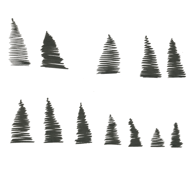- These are the drawing of trees I scanned in and added into the landscape. I combined them together and re-sized them to get natural looking clumps of trees.